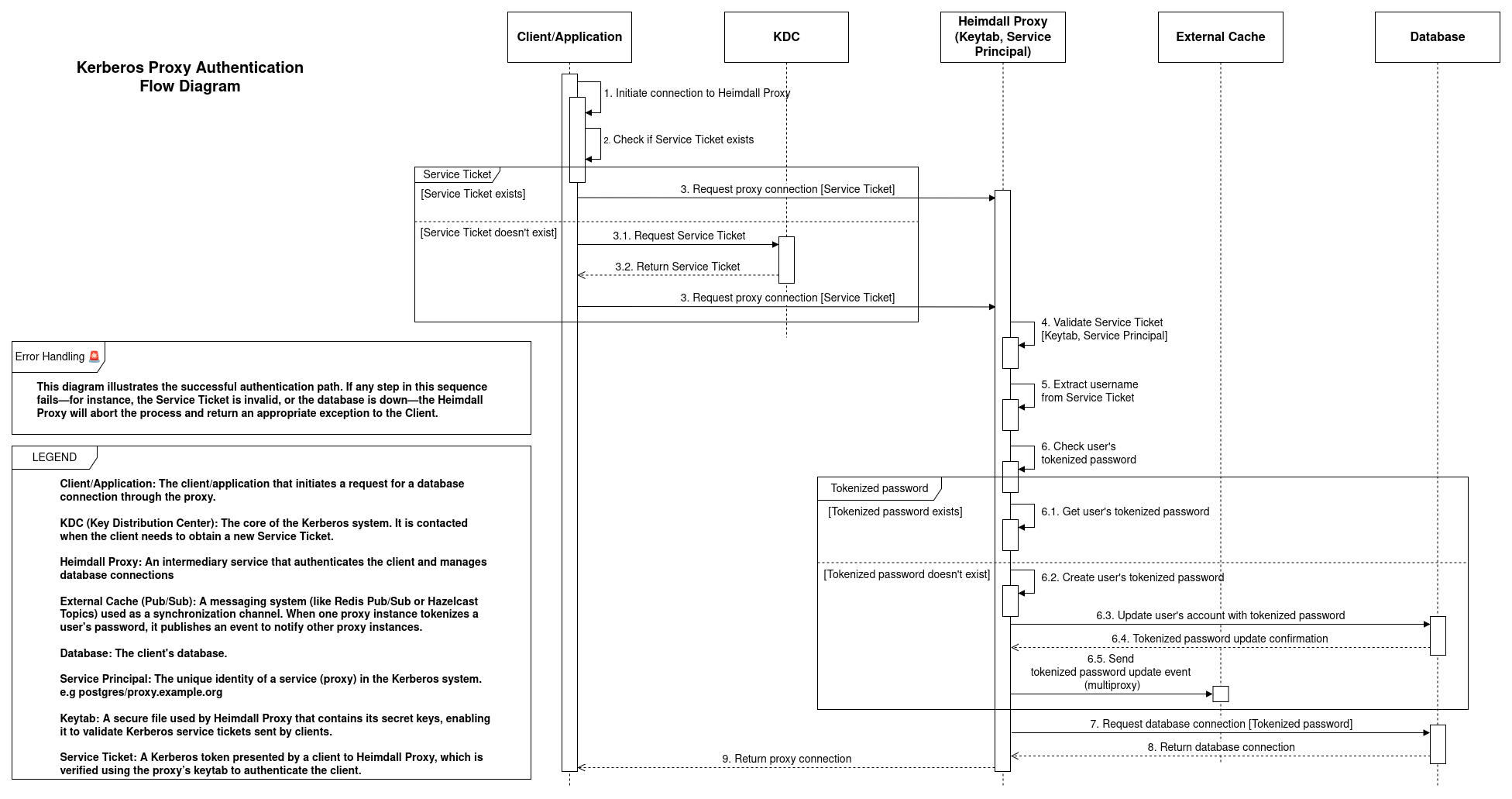 The generated keytab file must be distributed to every host that will run the proxy service to ensure seamless Kerberos authentication. The distribution method depends on the system's architecture and requirements. A simple method, for example, is to transfer the keytab using the SCP command. However, this approach may be challenging in an autoscaling environment. In such cases, for instance, within an AWS environment, the file can be stored in AWS Secrets and downloaded to a specified path when a new instance is created. This scenario is merely illustrative. It is crucial to ensure that the keytab file includes our SPN and is placed in a location specified in the Heimdall configuration (Virtual Database/Our VDB/Proxy Configuration/Keytab Location).